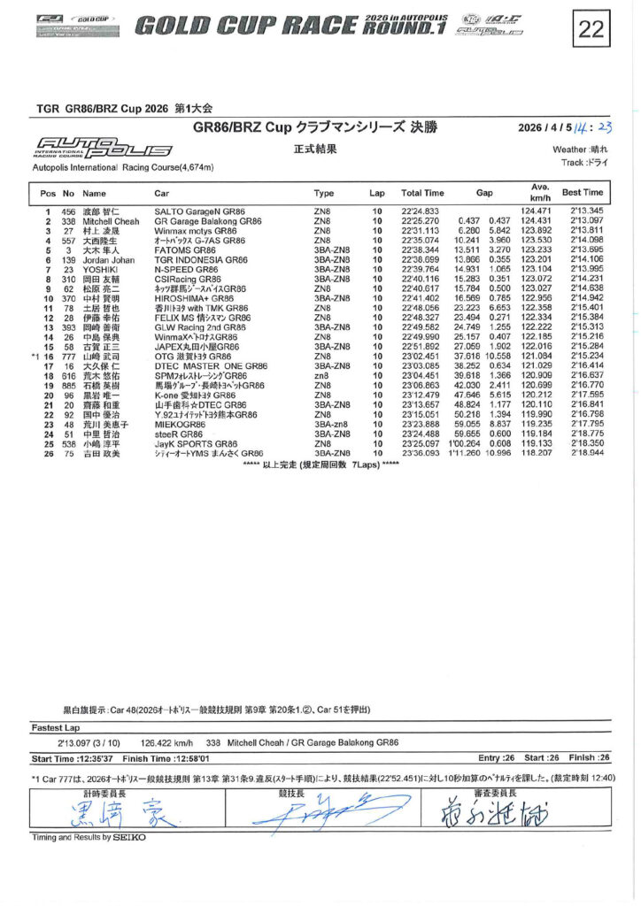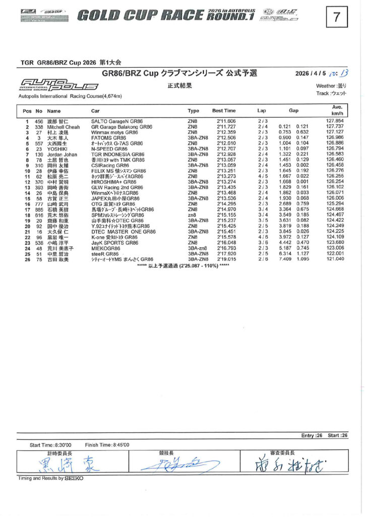 TGR GR86/BRZ Cup 2026 第1戦 リザルト By AVANTECH RT2026年4月27日2026年4月27日リザルト クラブマンシリーズ 予選結果(画像クリックでPDFがDLできます) 決勝結果(画像クリックでPDFがDLできます)